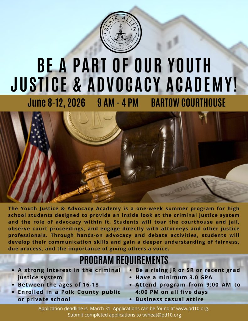 The PD10 Justice & Advocacy Academy is a new, immersive, week-long experience designed for motivated high school students interested in law, justice, and public service. Hosted by the Law Office of the Public Defender, Tenth Judicial Circuit, the Academy offers an inside look at the criminal justice system and the critical role of advocacy through hands-on learning and direct engagement with legal professionals.